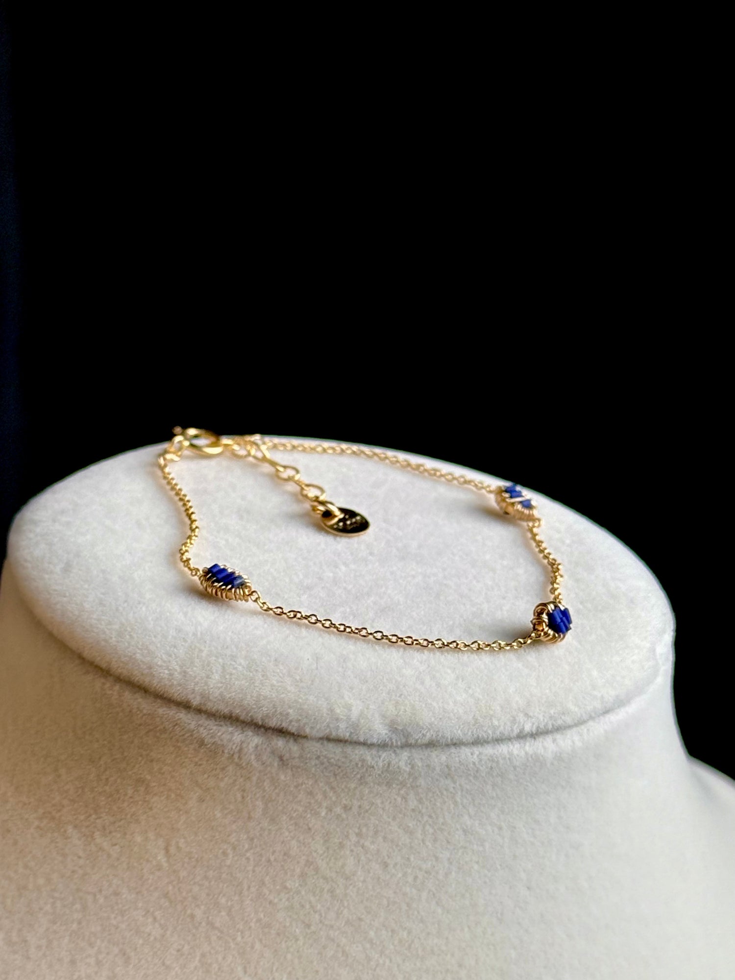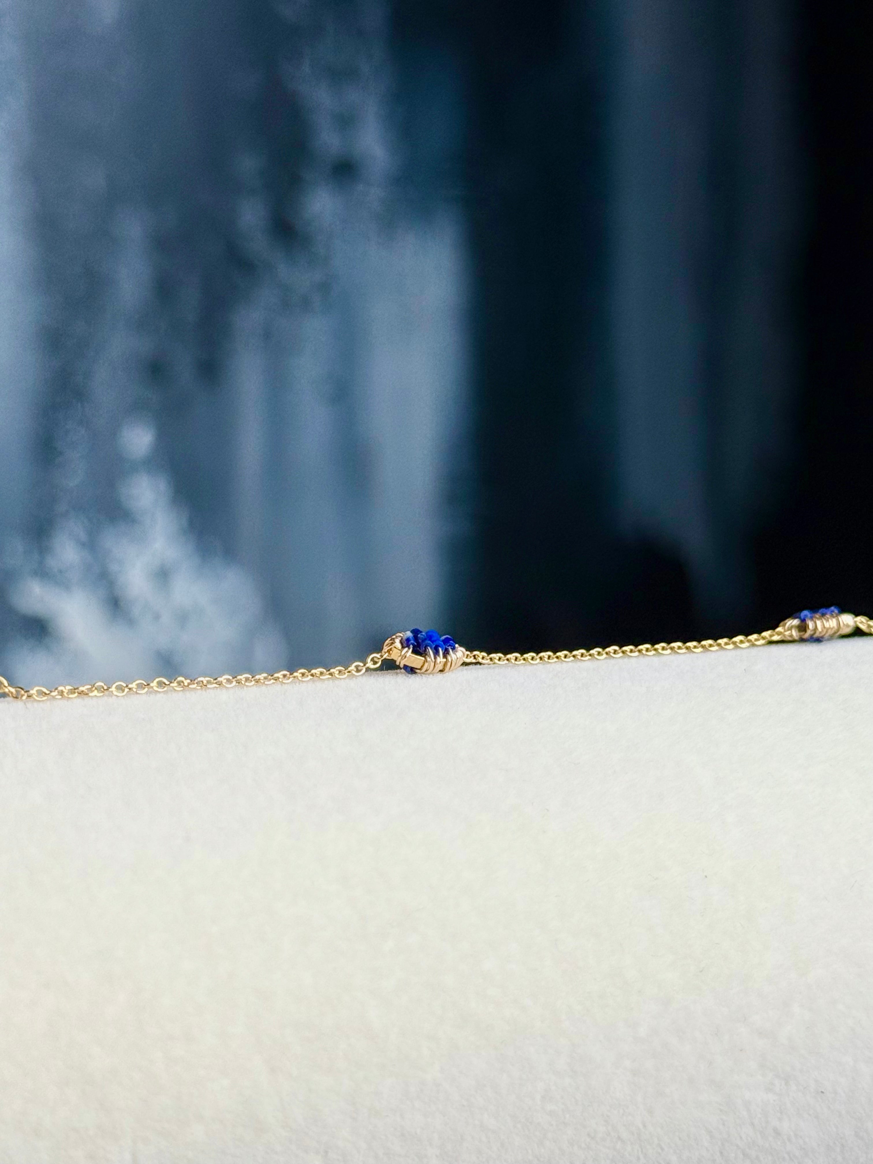 Add a touch of mystery and modern elegance to your jewelry stack with the Lapis Luxe Link Bracelet. Handcrafted from California, this dainty piece features rich cobalt blue crystals delicately wrapped in 18k gold-filled wire, giving it a luxe and luminous feel.