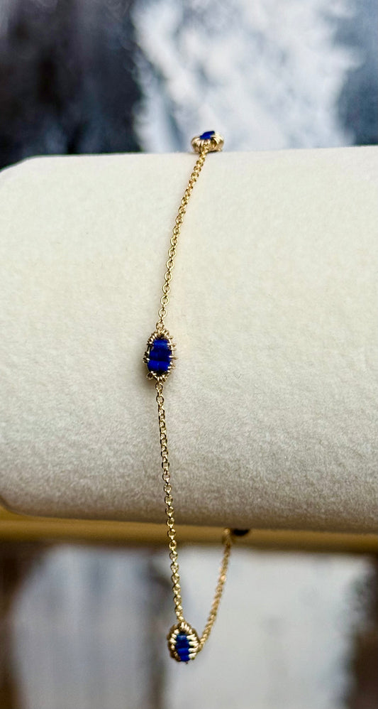 Add a touch of mystery and modern elegance to your jewelry stack with the Lapis Luxe Link Bracelet. Handcrafted from California, this dainty piece features rich cobalt blue crystals delicately wrapped in 18k gold-filled wire, giving it a luxe and luminous feel.
